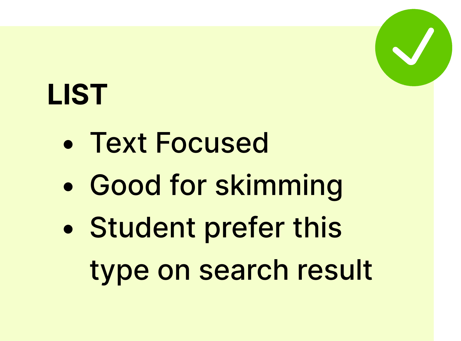 There are several problem on search result page. We need to make it better. We try to start to identify the most important information for student and exploring some idea.
